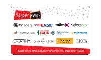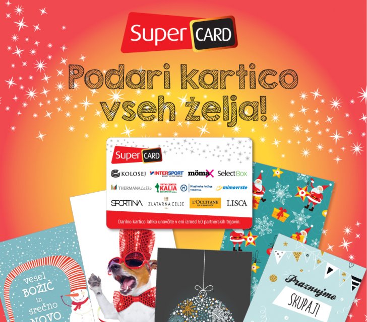 SuperCard kartica je darilo, ki se prilega vsakomur in je edina darilna kartica, ki jo lahko kupite preko spleta in jo koristite pri več kot 100 partnerskih trgovinah. Privoščite svojim najdražjim popolno darilo, ki ga lahko vnovčijo po lastnih željah. SuperCard kartice so na voljo v obliki zanimivih in tematskih voščilnic za različne priložnosti (božič, rojstni dan, poroka, rojstvo otroka ali kot zgolj pozornost za vam poseben in vesel dogodek) ter v obliki Darilnega bona želja. SuperCard kartice lahko kupite v različnih vrednostih, in sicer v vrednosti 15€, 25€, 50€ ter 100€.